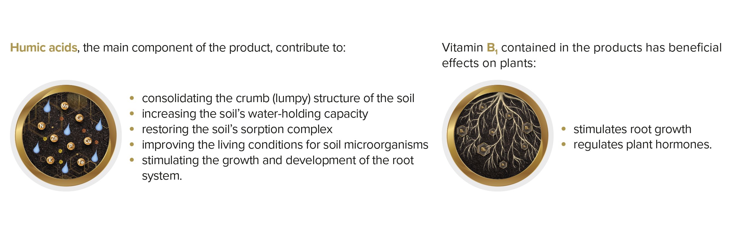 HUMIRES™ contains 55% of humic substances derived from leonardite. The product was enriched with vitamin B1, which has a stimulating effect on the development of plant root system.