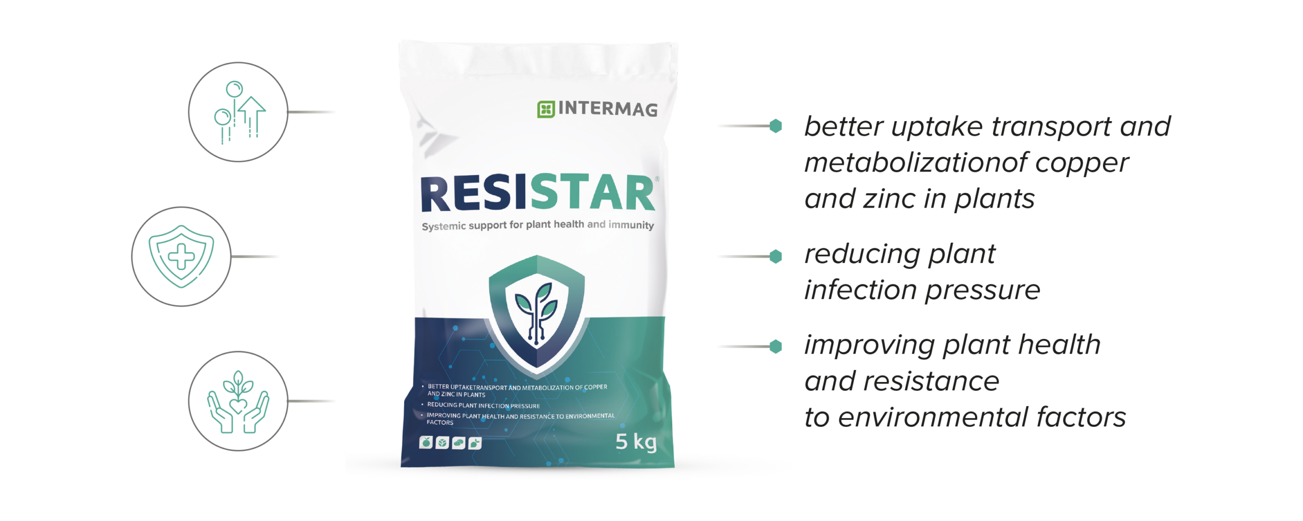 RESISTAR® improves plant health during cultivation and storage, and activates and strengthens natural plant immunity mechanisms. Thanks to organic complexes in the form of GCAA, copper and zinc are absorbed and transported very effectively to various plant organs, ensuring action throughout the plant rather than only at the application site. The presence of silicon in the duoSIL® formula increases both mechanical and biological resistance to stress factors.